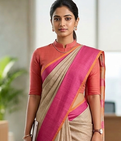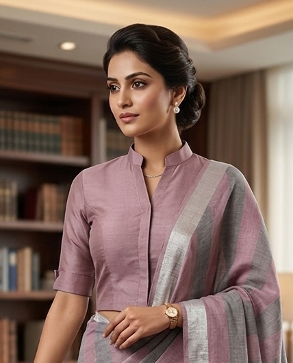 Nothing says “authority” like a high-neck blouse. Additionally, it provides a clean, elongated look that works exceptionally well with vertical-striped sarees.