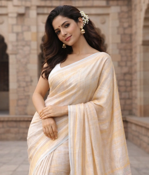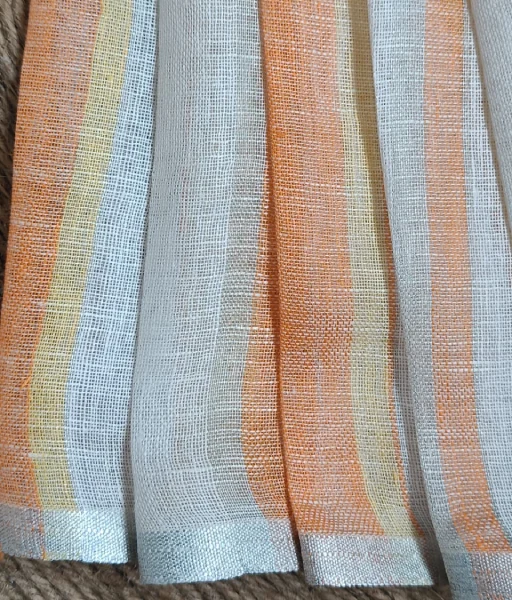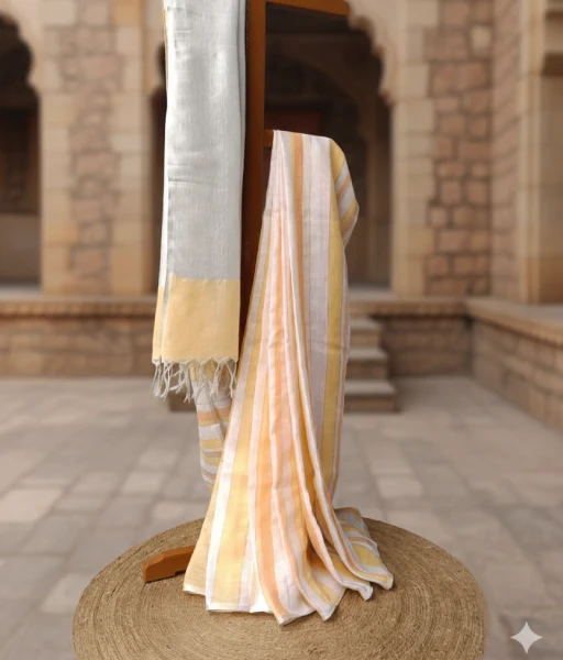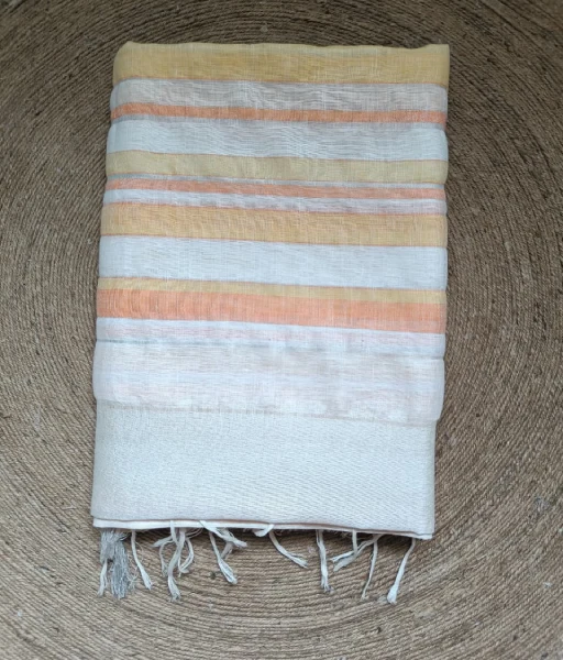 Beige Pure Linen Saree with Orange and Yellow Stripes