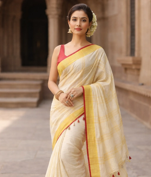 Crafted from breathable pure linen, the saree offers a lightweight texture and a comfortable, flowing drape suitable for extended wear. It comes paired with a matching red striped blouse that complements the contrast border while adding visual interest to the ensemble. Ideal for daytime occasions, festive gatherings, and elegant everyday styling, this saree reflects timeless linen craftsmanship with refined colour contrast.