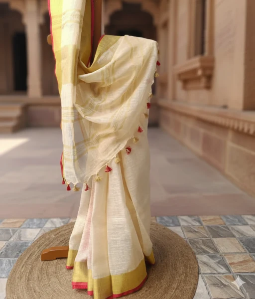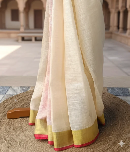 This cream pure linen saree brings together classic neutrals with bold contrast detailing. The soft cream base is framed by a rich red contrast border, further enhanced with intricate golden zari detailing along the border and aanchal. The warm tones of the zari work add a graceful glow, creating a balanced design that feels both traditional and contemporary.