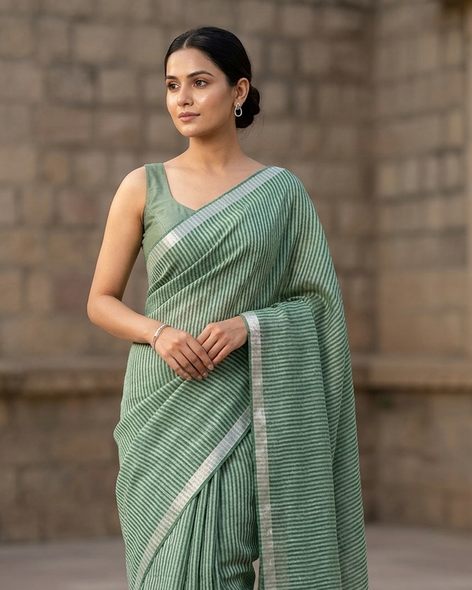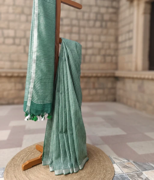 A deep dark green pure linen saree featuring elegant silver zari stripes and a refined zari border, paired with a matching blouse.