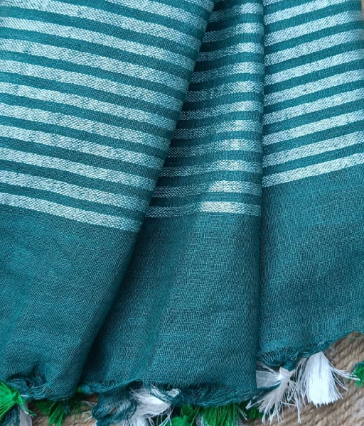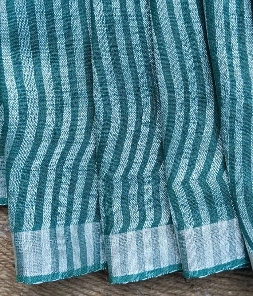 Dark Green Pure Linen Saree with Silver Zari Stripes