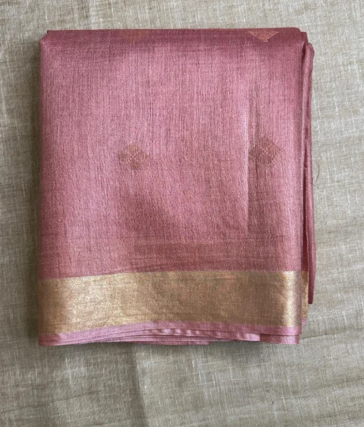 The saree is adorned with intricate golden zari buta motifs woven across the body. These delicate details add richness and depth to the soft onion pink base. In addition, a classic golden zari border frames the saree beautifully, while the elegantly designed aanchal enhances its overall appeal. Together, these elements create a graceful balance of tradition and sophistication.
