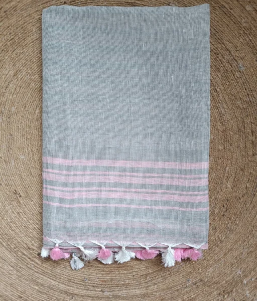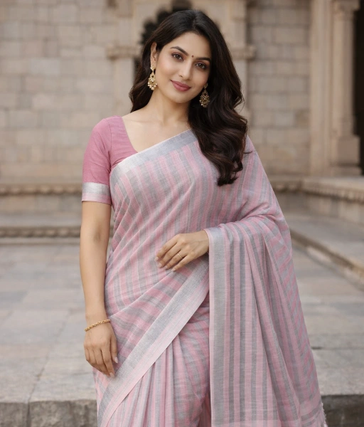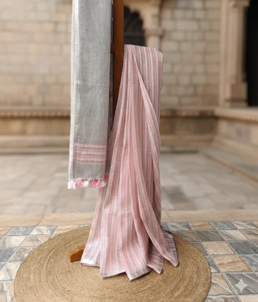 Overall, this grey and pink pure linen saree blends breathable comfort, modern striped design, and subtle traditional detailing, making it a timeless addition to the Sutraa Looms collection.