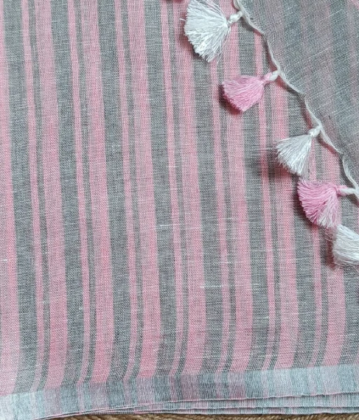Pink Pure Linen Saree with Grey Stripes and Silver Zari Border