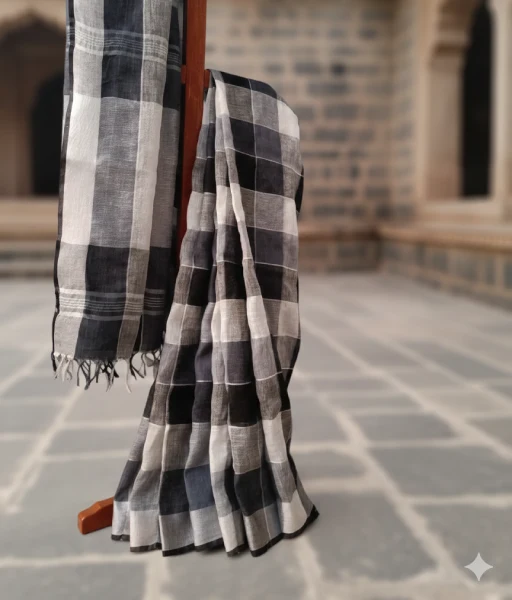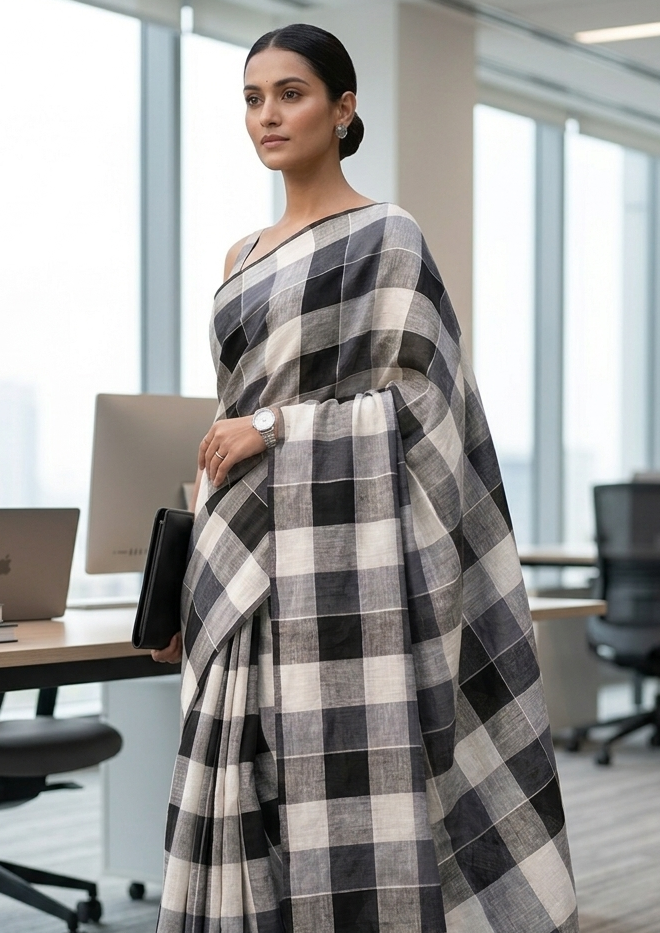 To begin with, the saree features classic black and white checks, which create a bold yet balanced look. At the same time, the pattern reflects traditional handloom design while keeping a modern touch. Because of this, it works perfectly for both casual and formal settings.