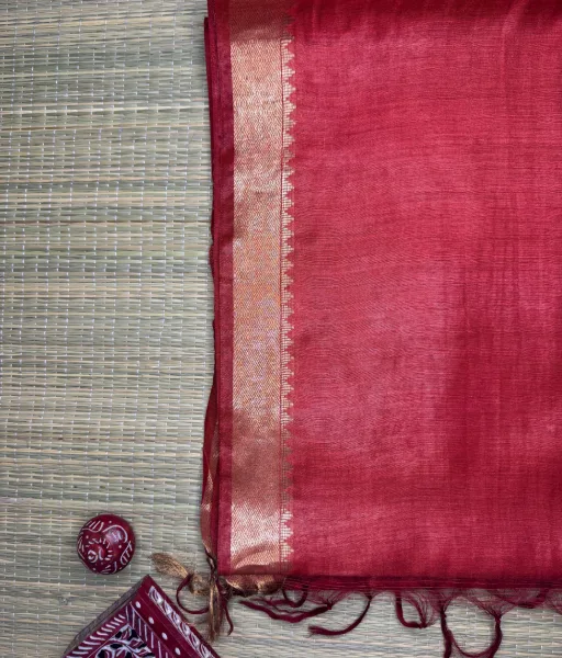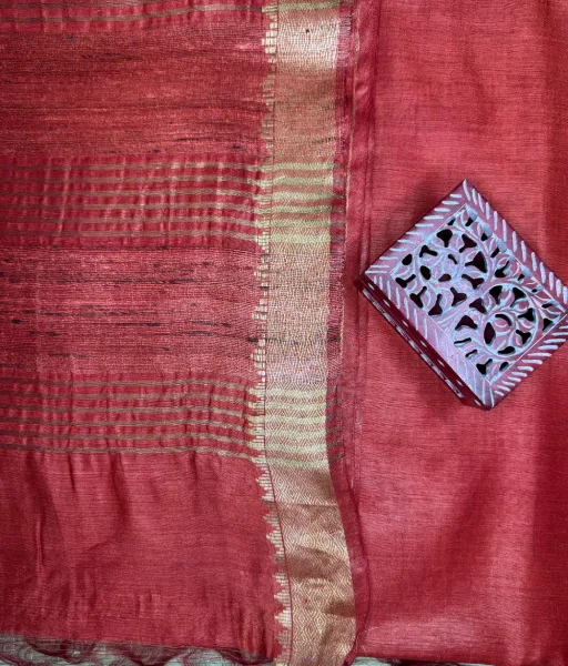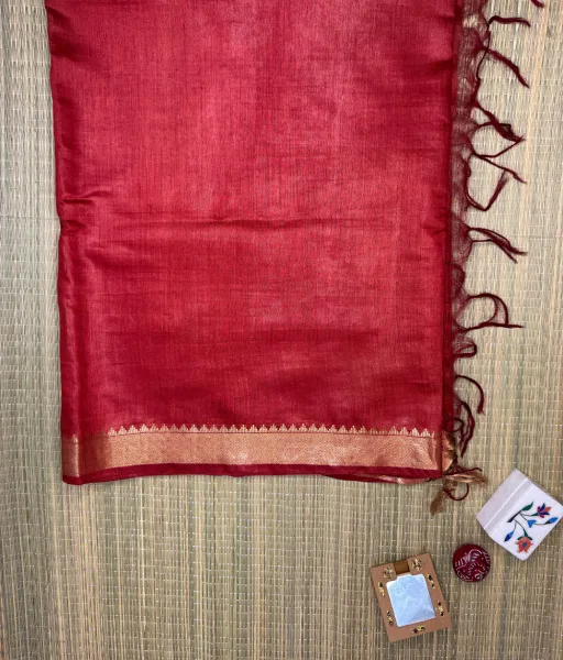 This rust red munga tussar silk saree is designed for effortless elegance and classic sophistication. Crafted from premium munga tussar silk, it is known for its natural texture, subtle sheen, and lightweight drape that offers comfort while retaining a distinctive handcrafted character.