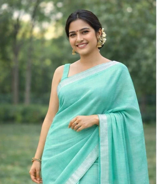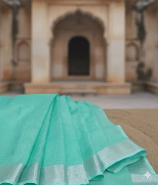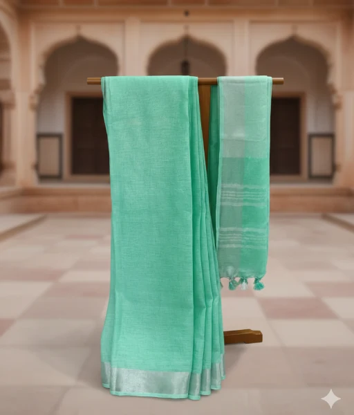 This sea green pure linen saree is designed for those who appreciate simplicity elevated by fine craftsmanship. The saree features delicate silver zari detailing along the border and aanchal, lending a gentle shimmer that complements the soothing sea green base without overwhelming it. The clean finish and balanced design make it a timeless addition to a handloom-inspired wardrobe.